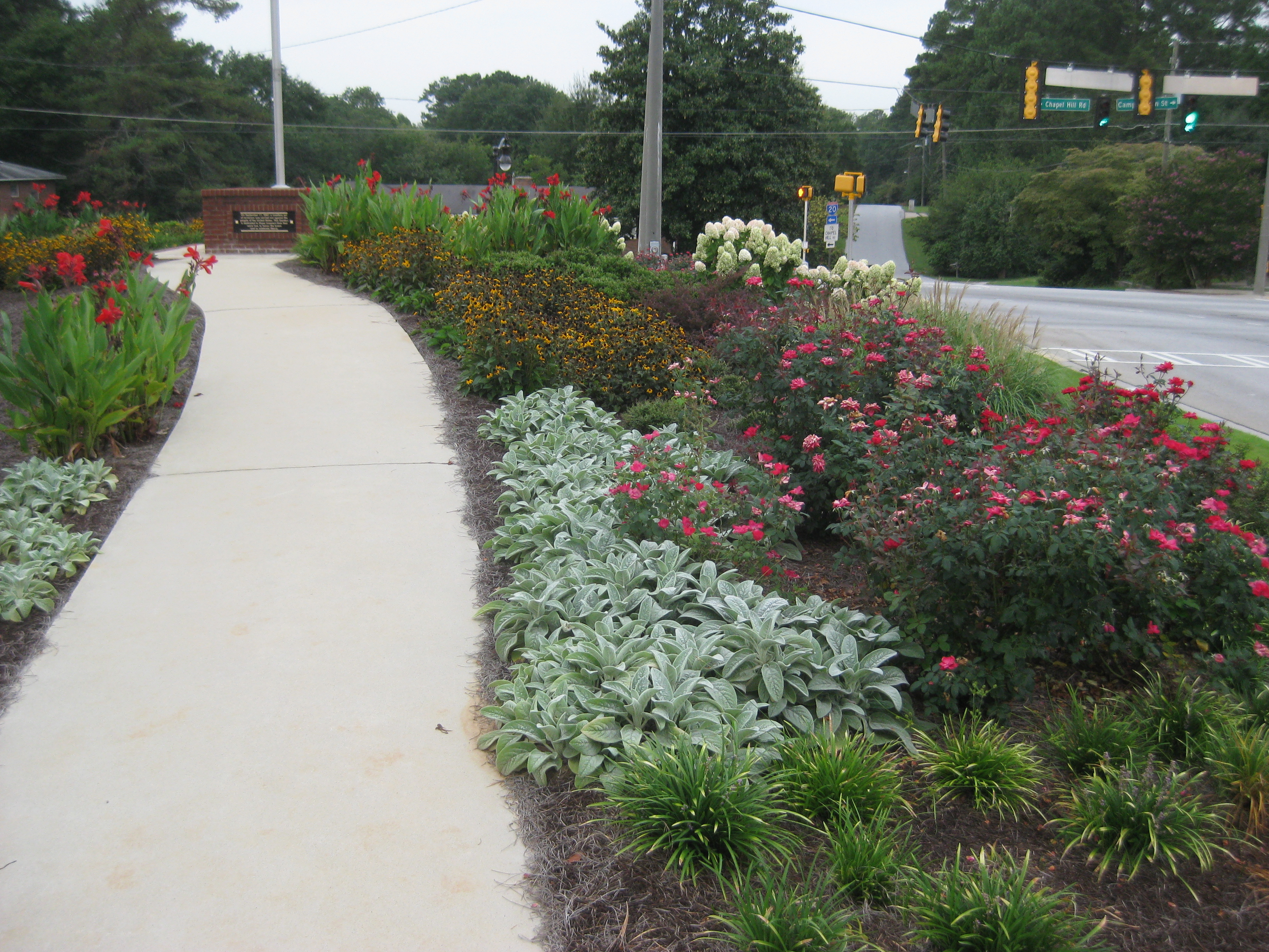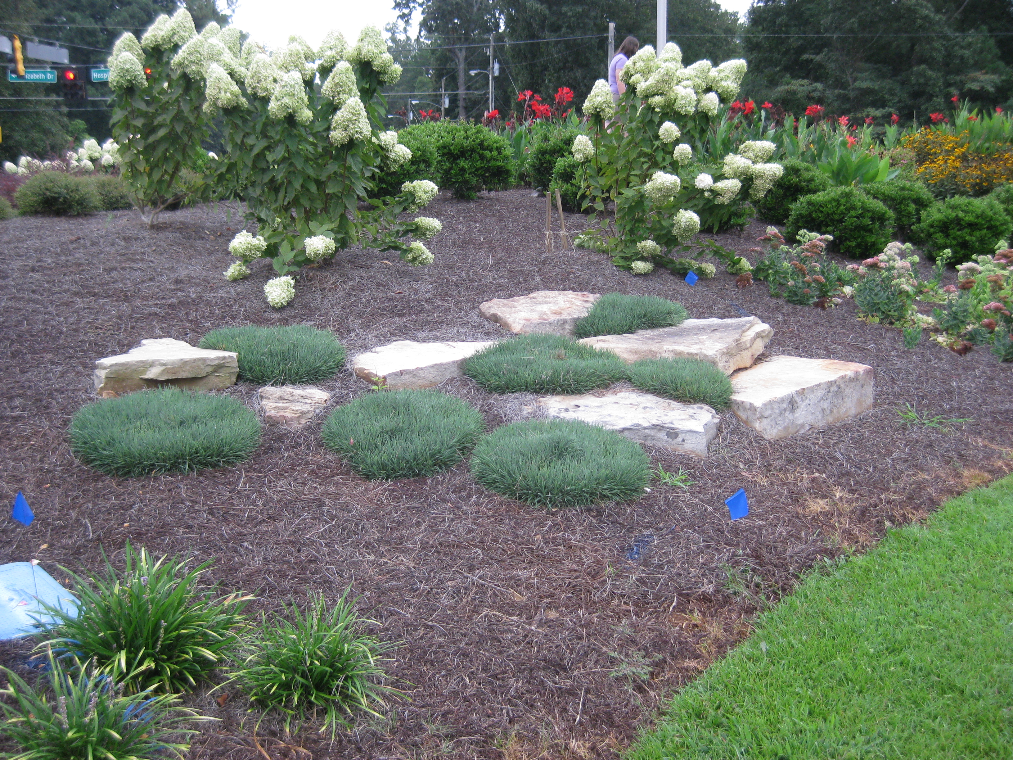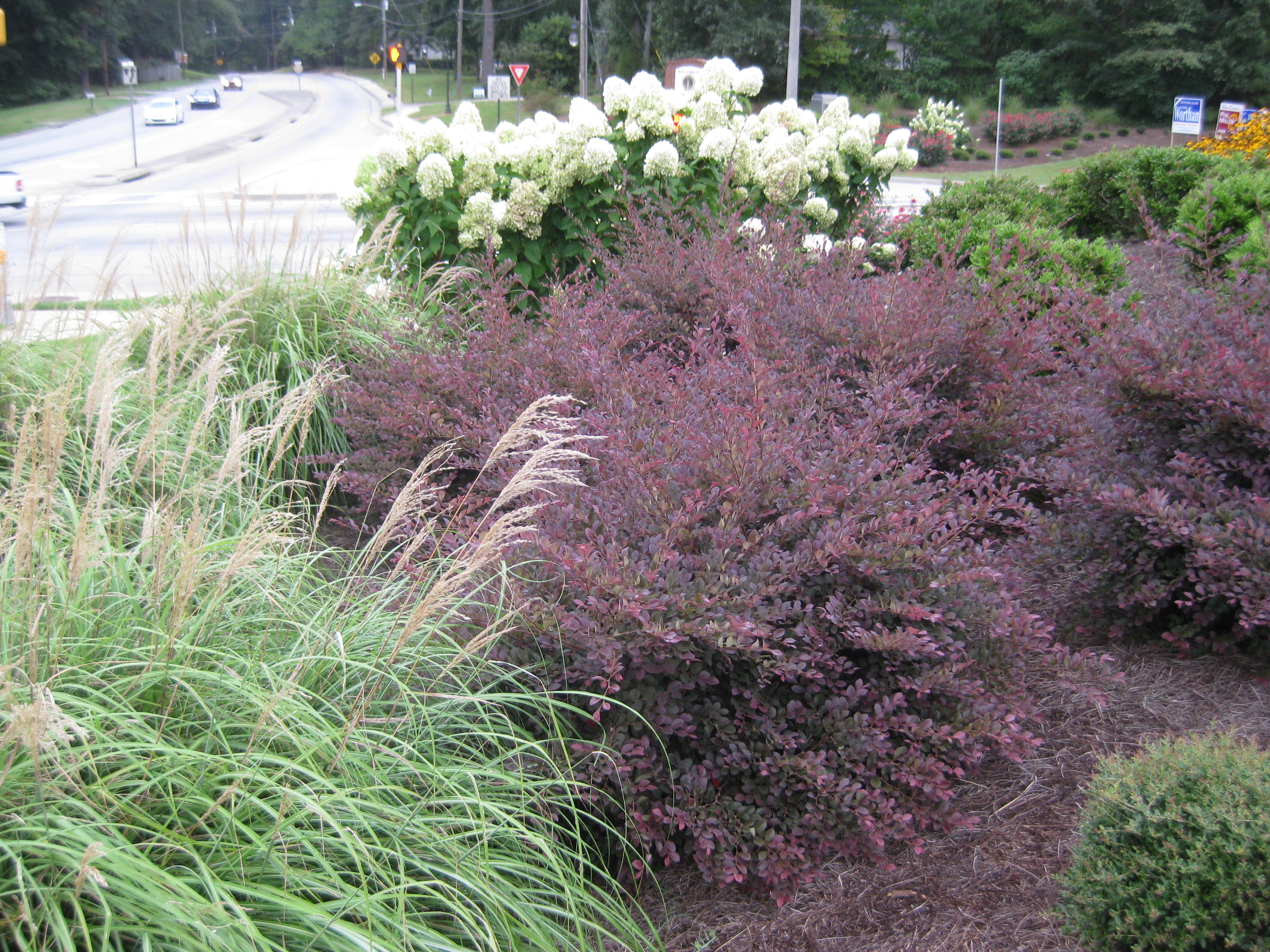 There are mixtures of texture organized in repetitions of massed plant groupings . The plants were also selected to produce a continual bloom cycle through the year. Even the winter winds provides interesting motion in the garden as the miscanthus grass blades wave with their blooms beside the dry spent Lime Light hydrangea blossoms. All designed to be enjoyed by pedestrians or passengers in a 35mph drive by. The stop at the traffic light intersection is the best quick visual burst between the ears in Georgia.
