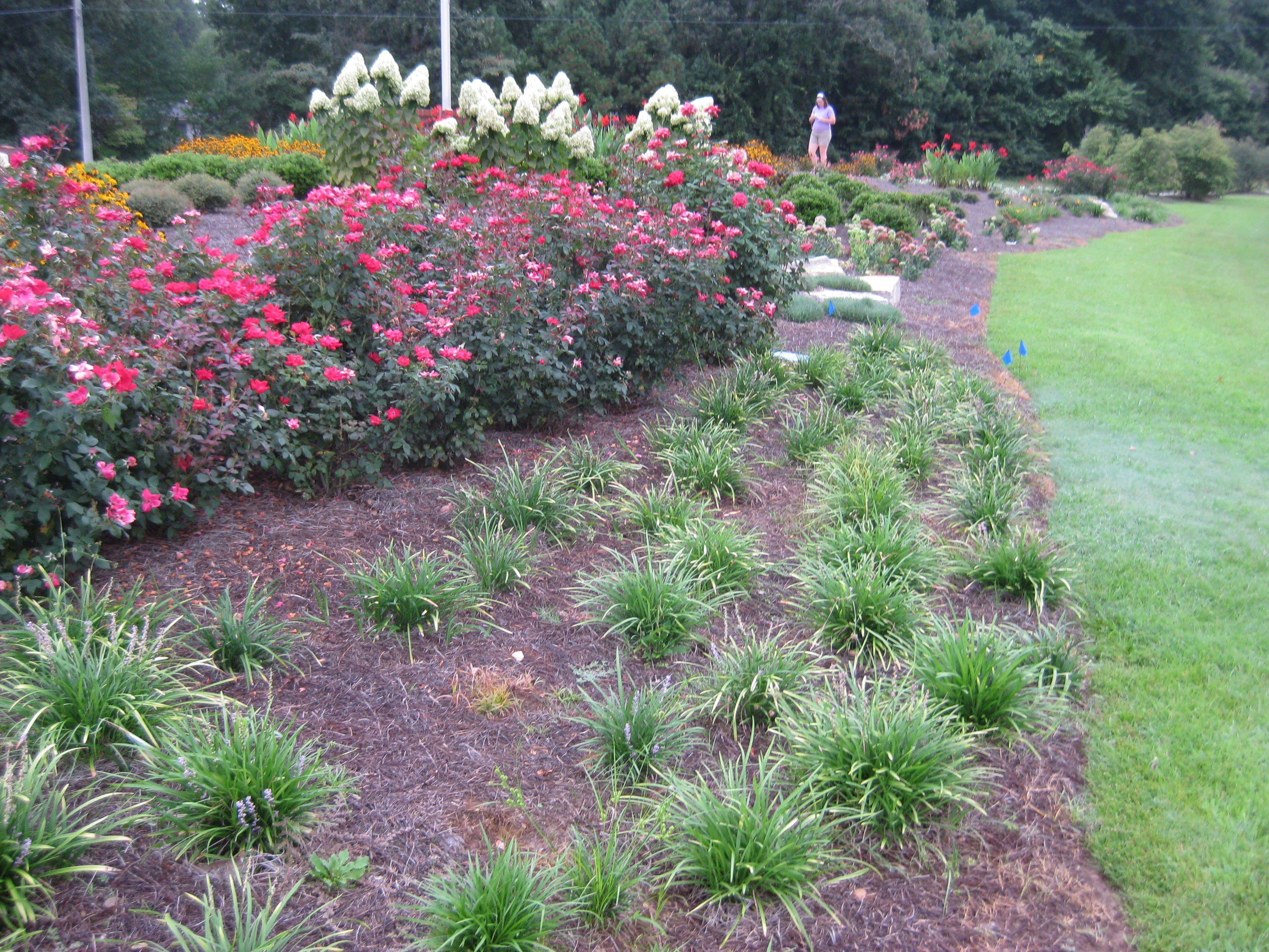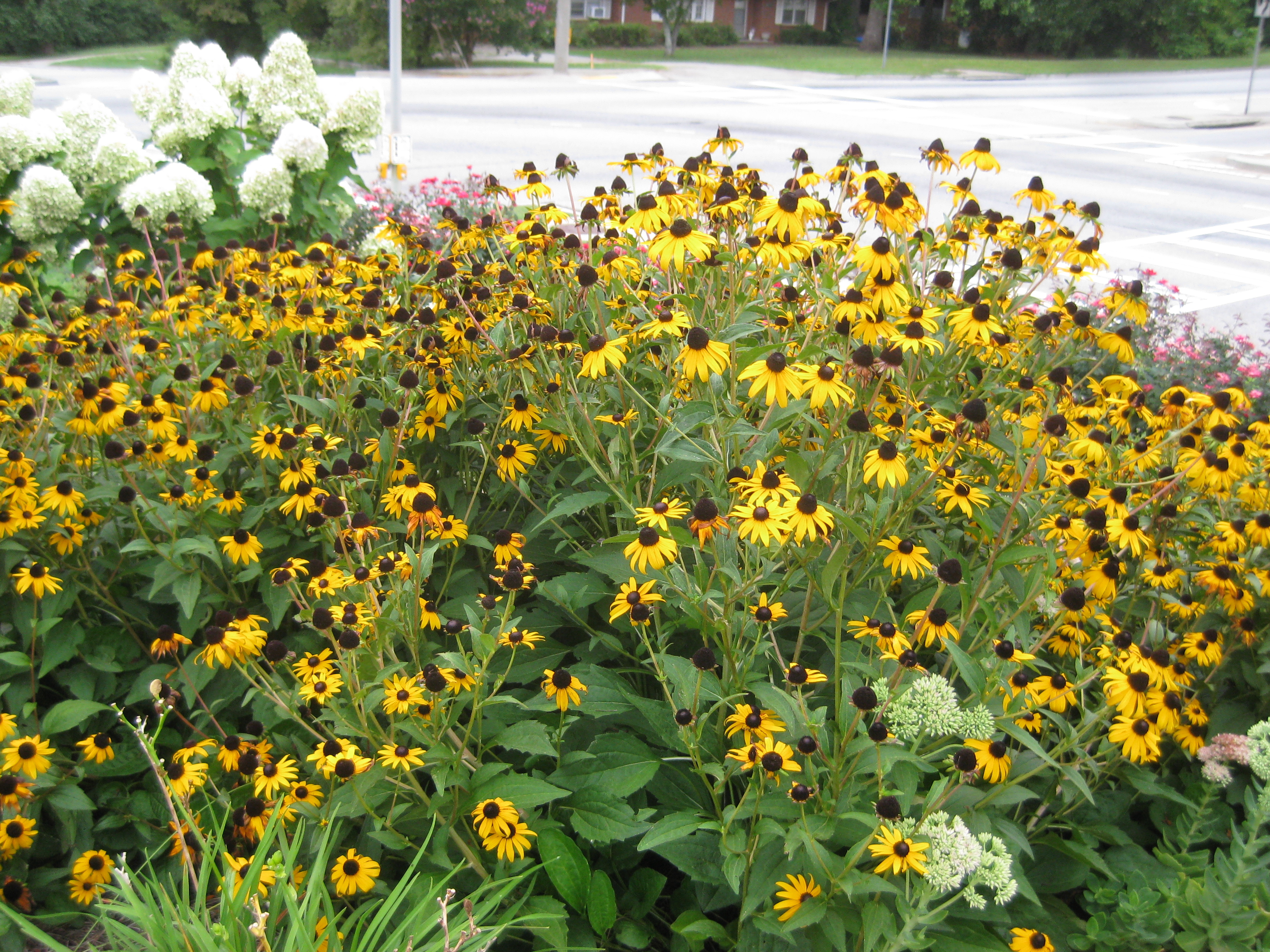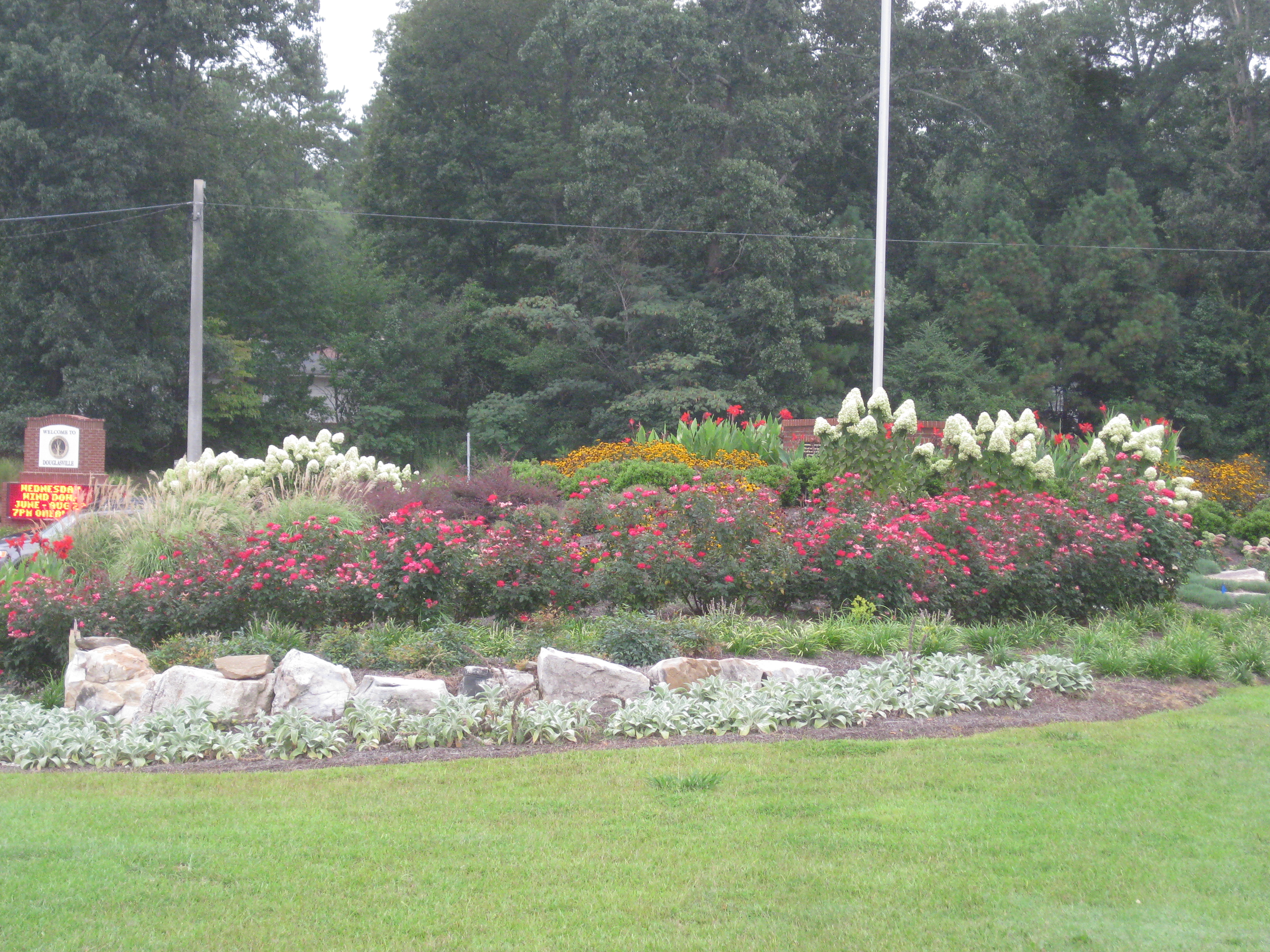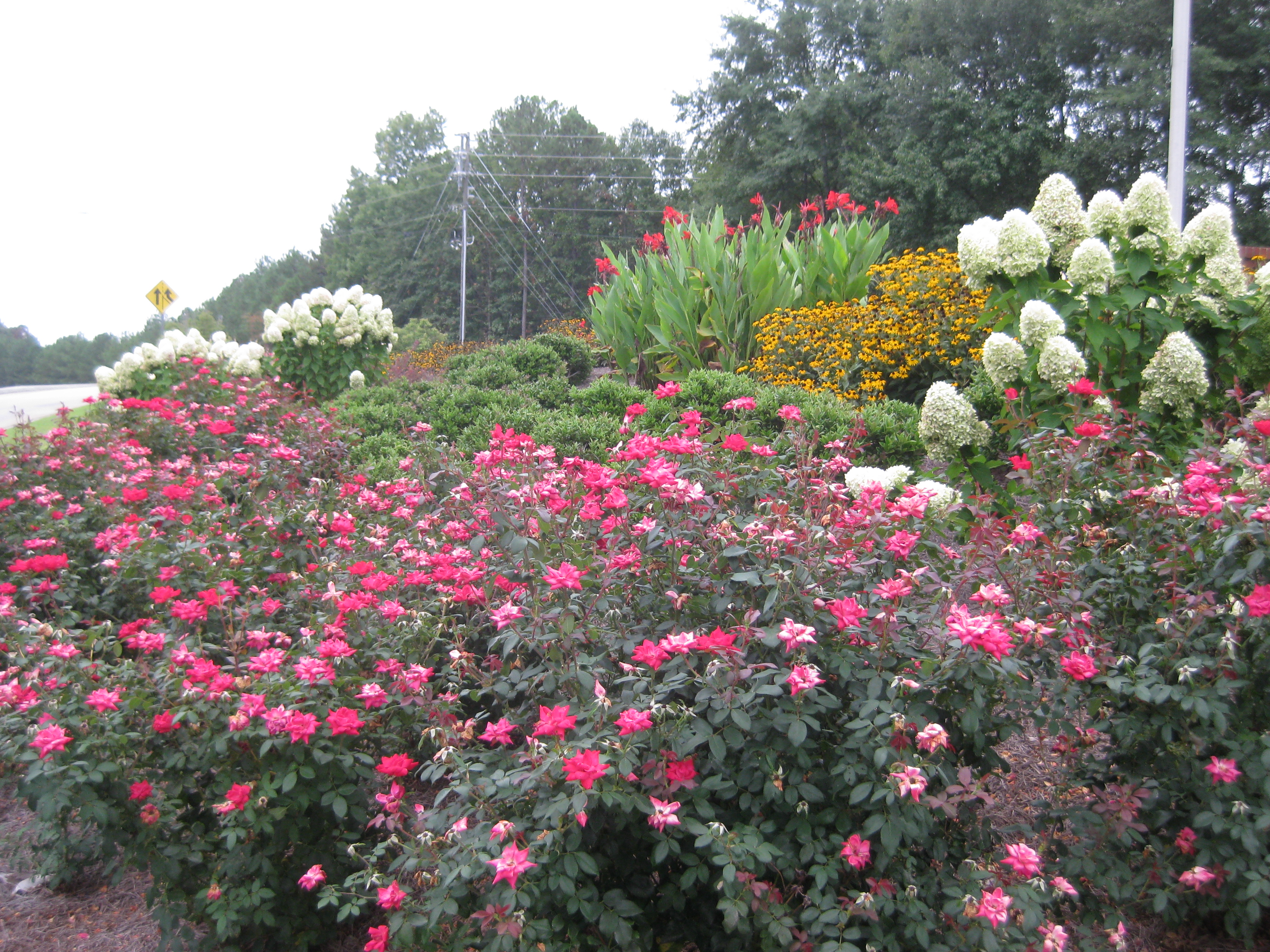 There are mixtures of texture organized in repetitions of massed plant groupings . The plants were also selected to produce a continual bloom cycle through the year. Even the winter winds provides interesting motion in the garden as the miscanthus grass blades wave with their blooms beside the dry spent Lime Light hydrangea blossoms. All designed to be enjoyed by pedestrians or passengers in a 35mph drive by. The stop at the traffic light intersection is the best quick visual burst between the ears in Georgia.